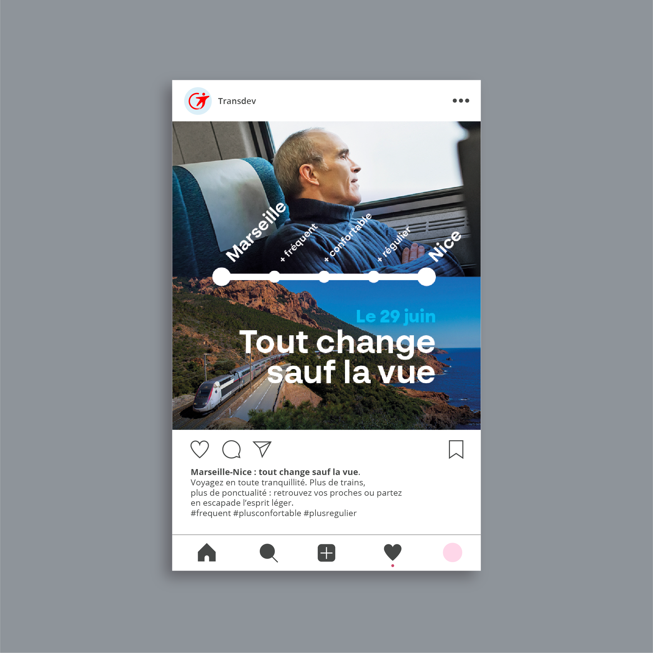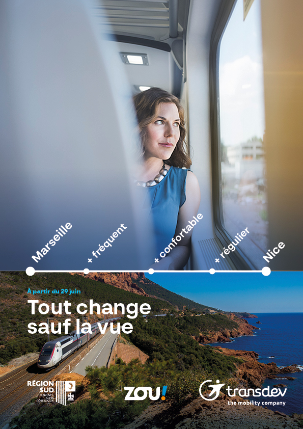 Création d’un principe de campagne pour l’arrivée de Transdev sur la ligne TER Marseille/Nice. Création du principe de campagne, rédaction de l’accroche. Réalisée pour l’agence Euphoriques