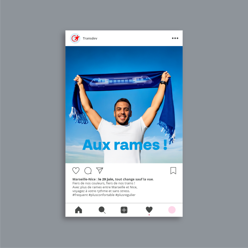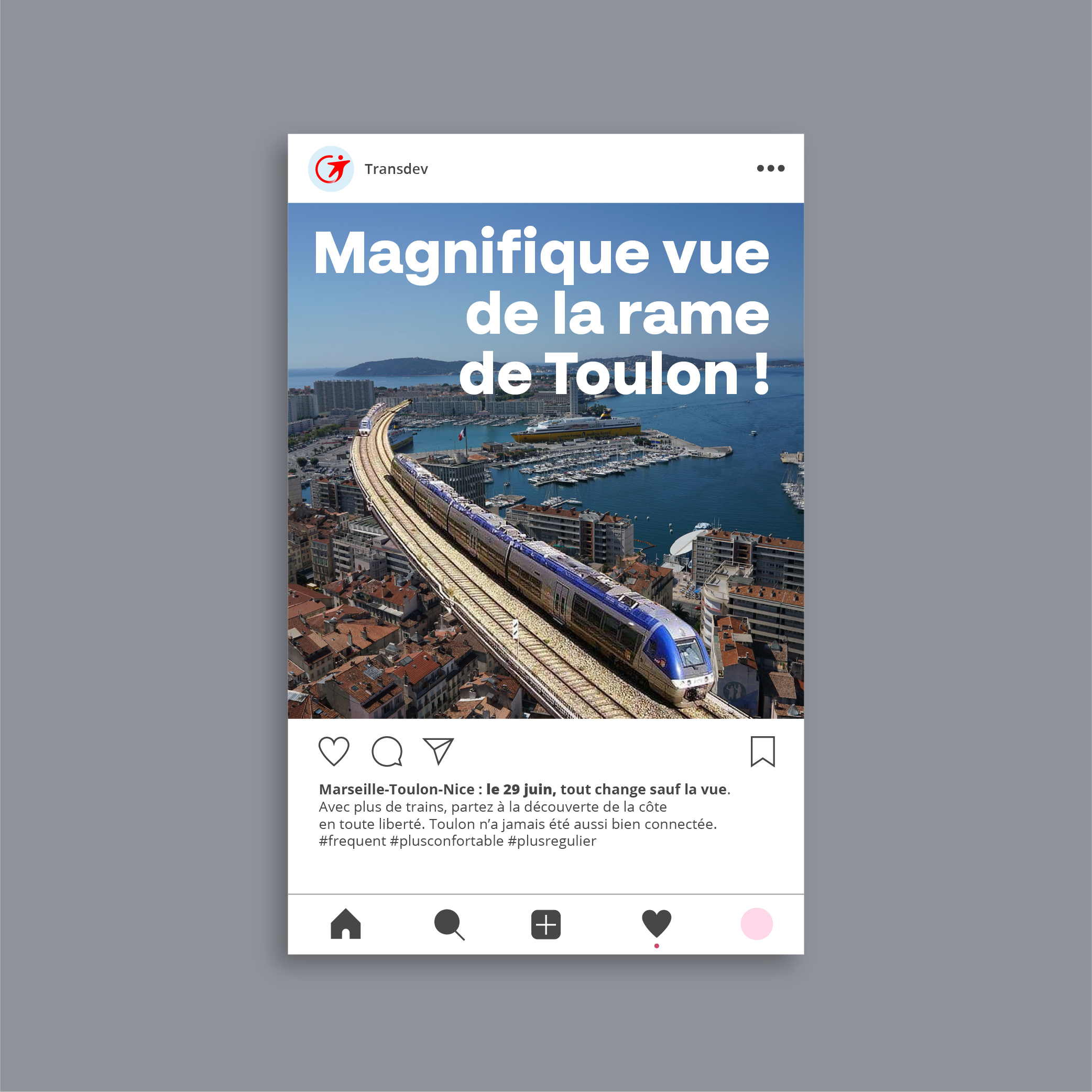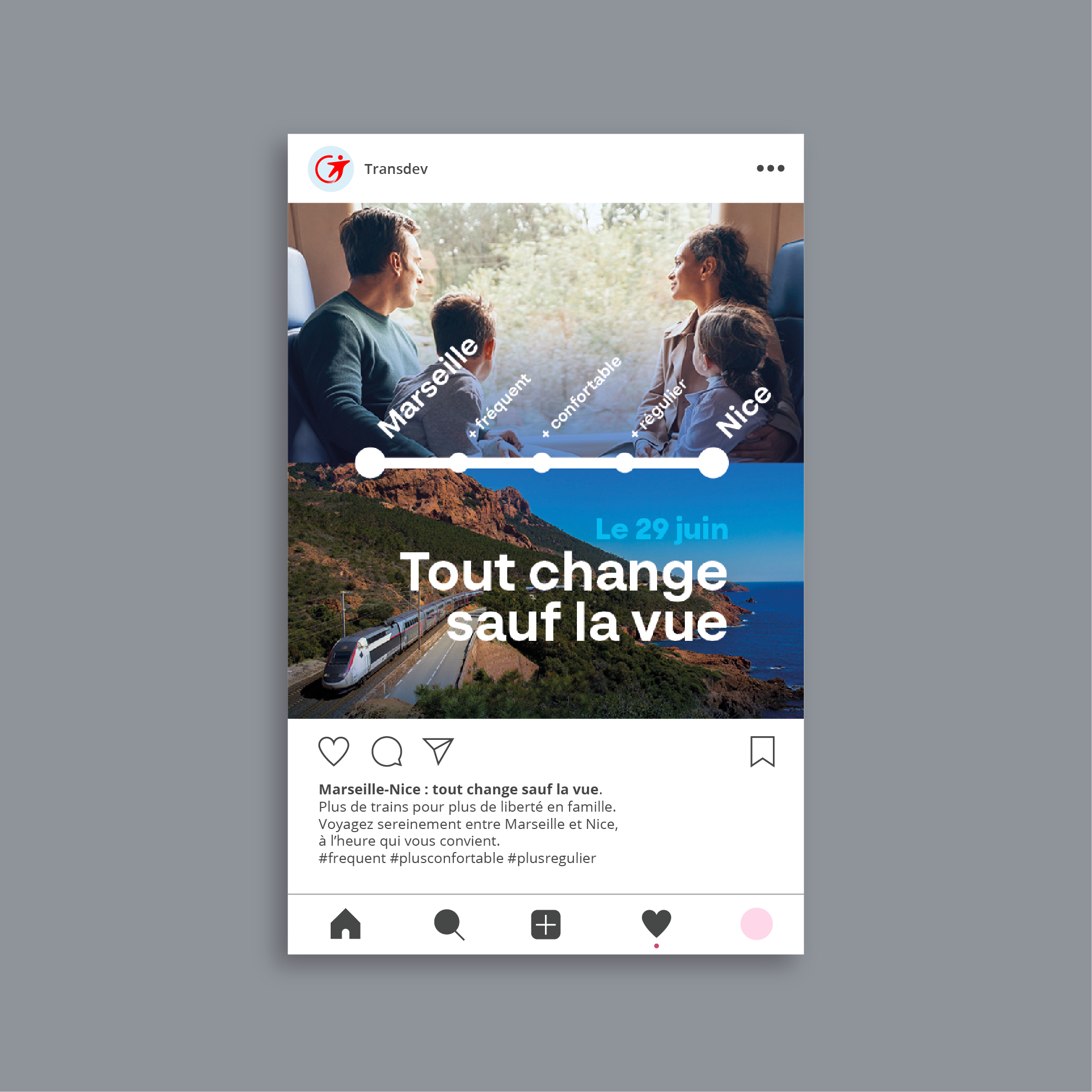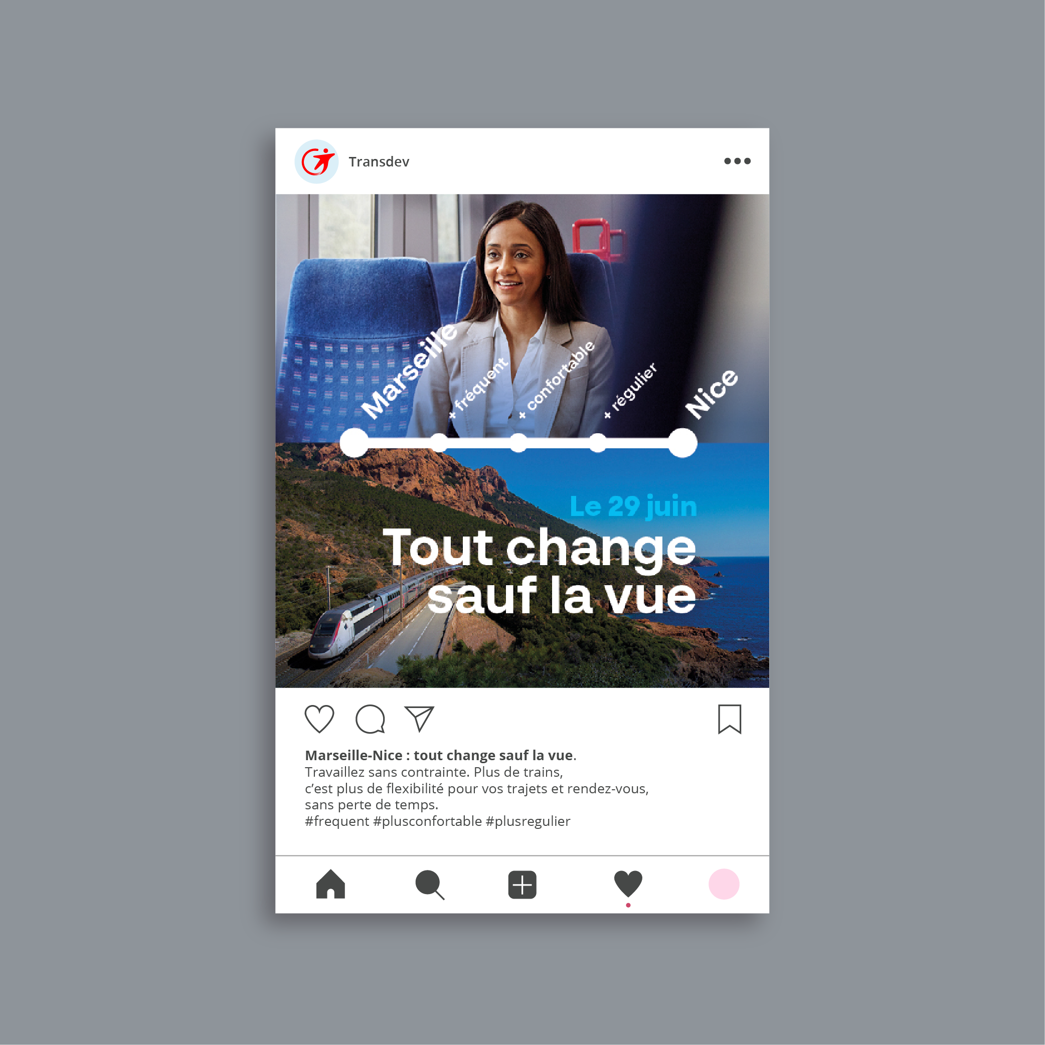 Création d’un principe de campagne pour l’arrivée de Transdev sur la ligne TER Marseille/Nice. Création du principe de campagne, rédaction de l’accroche. Réalisée pour l’agence Euphoriques